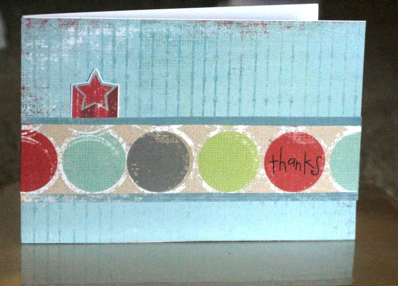 I saw the Tuesday Trigger challenge over at Moxie Fab World and knew I had to do something with those colors for Charlie's overdue birthday thank you cards! He had a Buzz Lightyear party so the colors were perfect and I had this polka dot paper that worked too! Click HERE to play along!